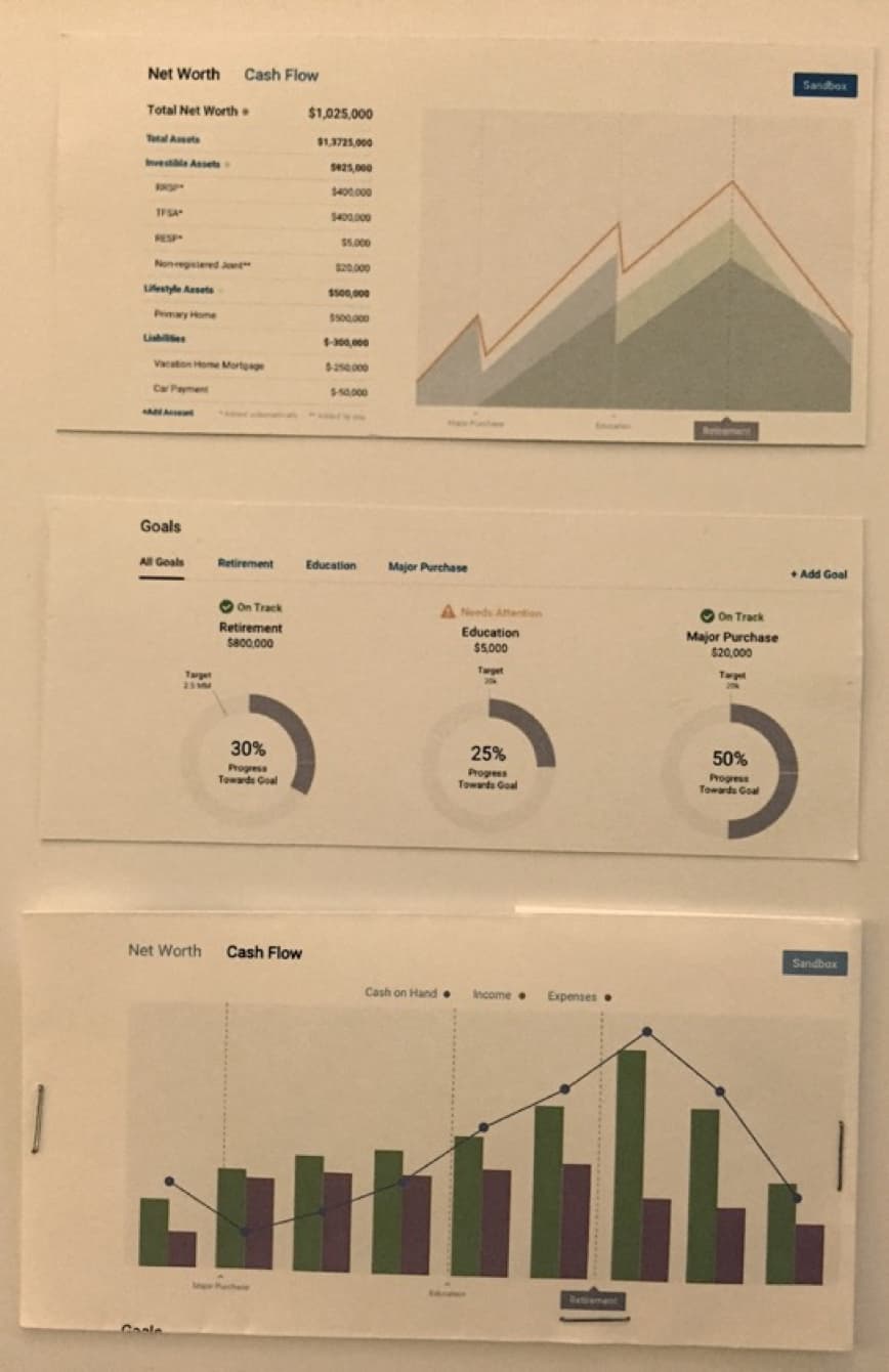 I ran multiple rounds of tests to nail down the best direction for the financial picture module. Using paper protoypes, I was able to quickly create different combinations of layout, styling, as well as information fidelity for the tests. It is also important to note that I tested existing RBC clients who would ultimately be the end users.