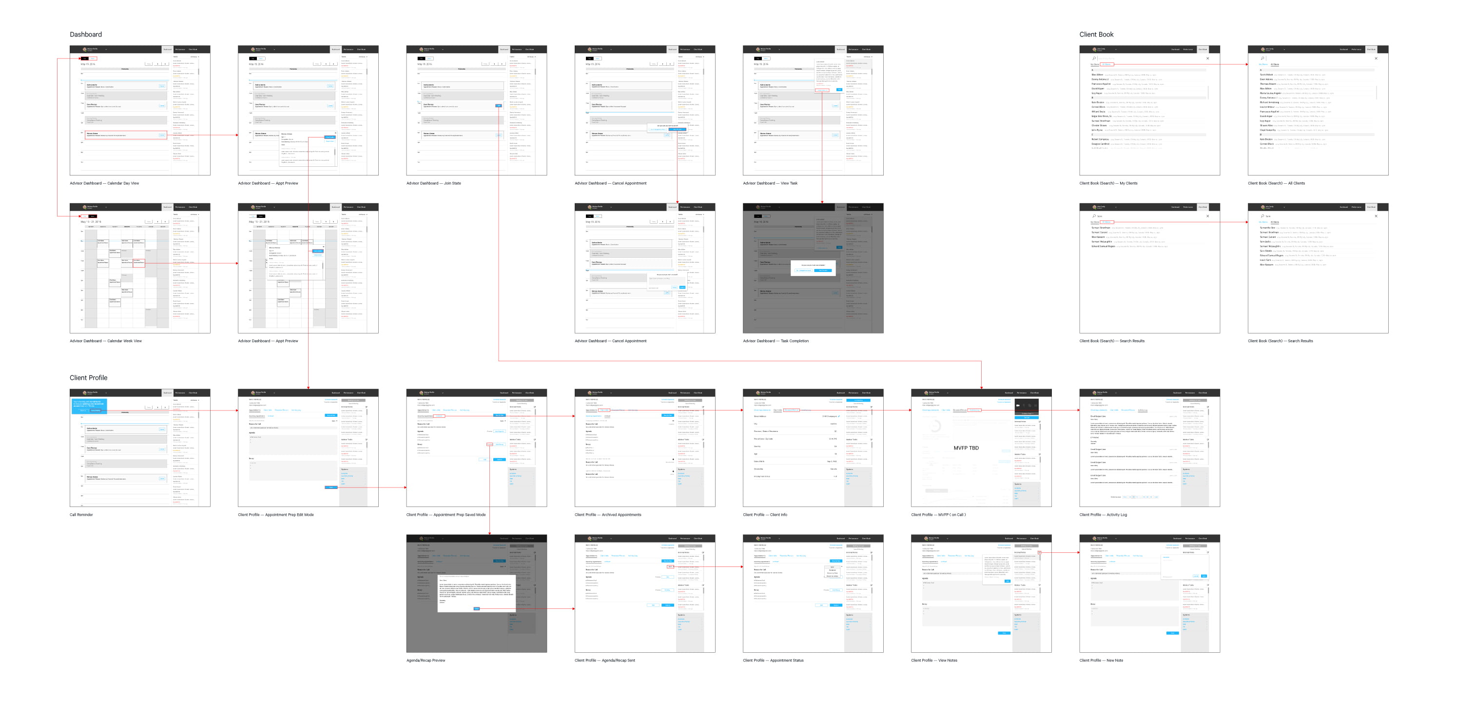 The final part before moving into UI design is to map out the IA of the client and advisor dashboards. This helps everyone in the team visualize how the whole thing comes together.