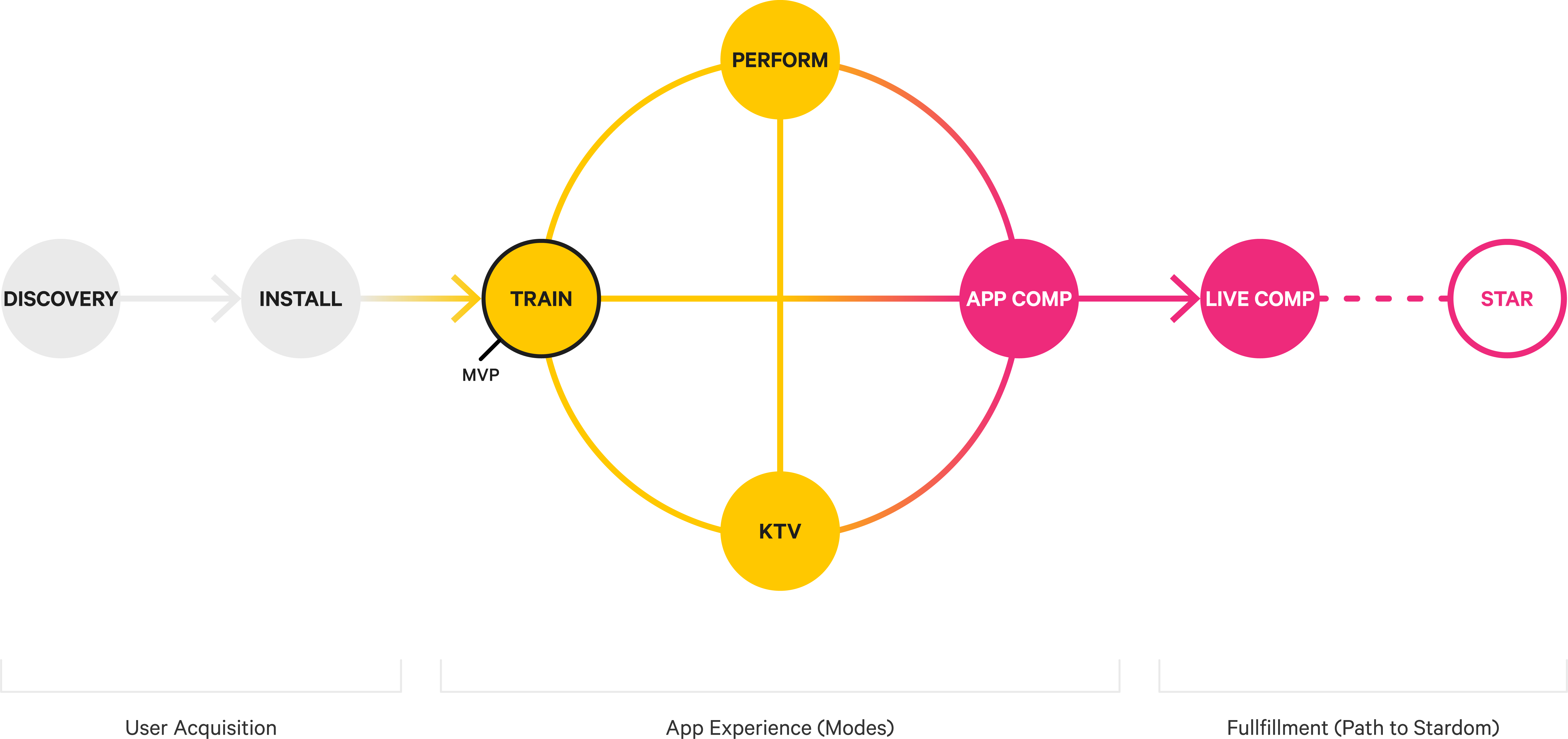 The other 3 modes, train, KTV, and perform are in place to effectively help users develop and improve—gettting them to the point where they feel they are ready to compete.