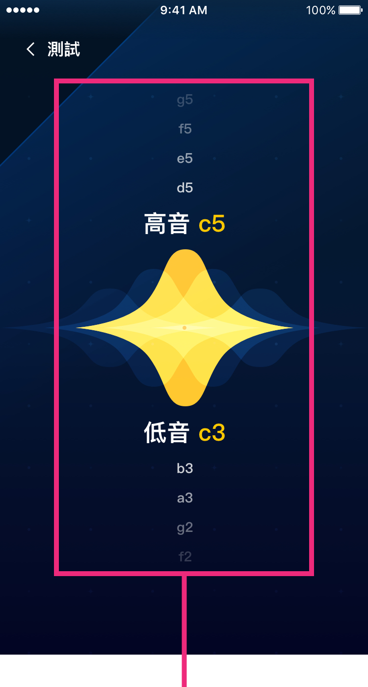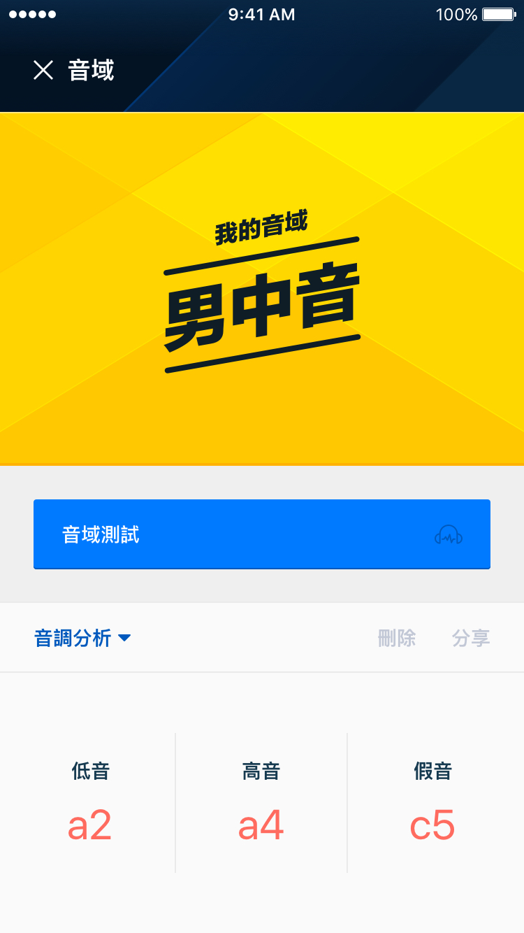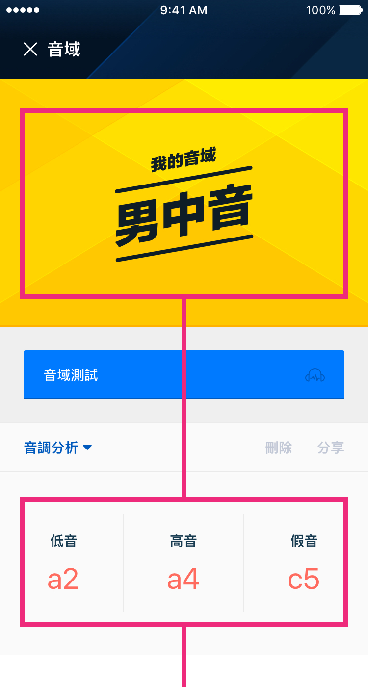 See your full vocal range (low—a2, high—a4, falsetto—c5) translated to your personal voice type (baritone)