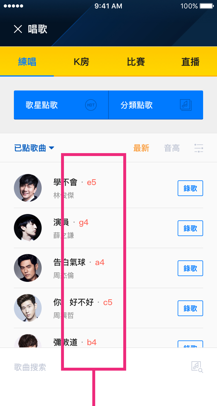 The app experience is built around 4 core modes: train, KTV, perform, and compete.
